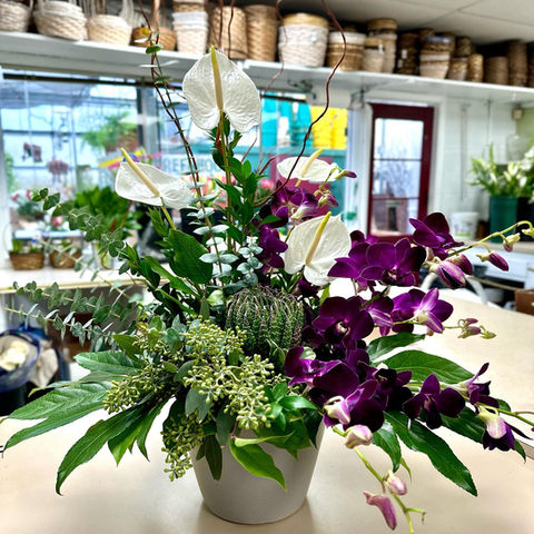 Our custom arrangements are created using beautiful fresh flowers that make a meaningful and memorable display. We have a variety of ready-made arrangements available for walk-in purchase, and we're happy to create a custom arrangement to fit any request, big or small.